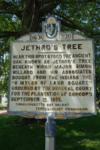 But the Englishmen insisted they needed to know where their bounds were. So the groups met under the Great Oak Tree – Jethro’s Tree – in the center of town, as it is now – five or more Englishmen and Squaw Sachem with several of her braves and they made a bargain agreeable to all. She asked for hatchets, hoes, knives, a little Wampumpeag (their form of money), but mostly the braves wanted cotton shirts, and Webbacowet wanted to look like Simon Willard, so they gave him a white shirt, a white linen band, a tall hat, shoes, white stockings and a great coat. Then Simon Willard set the bounds of the town by pointing to the four directions: 3 miles north, 3 miles east, 3 miles south and 3 miles west, making a six myle square area the white men could call theirs, and Squaw Sachem was satisfied. The natives could keep their hunting rights which were very important to them. This measurement of land became an example for other towns to follow.